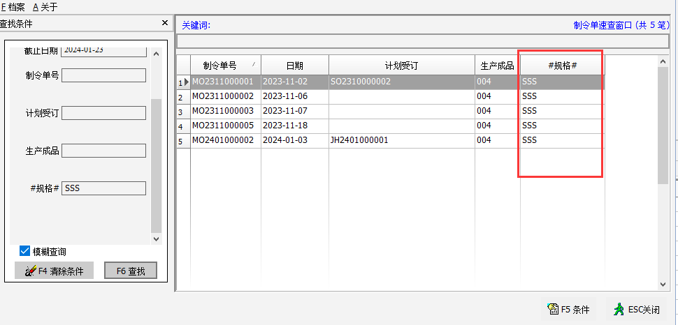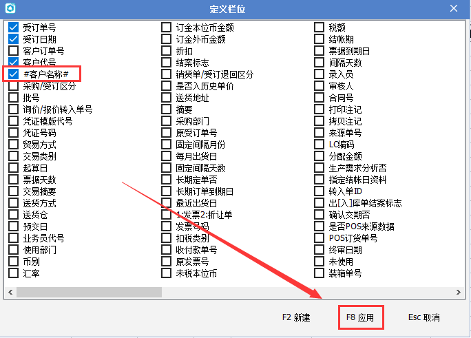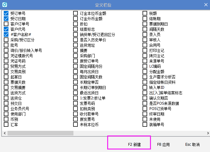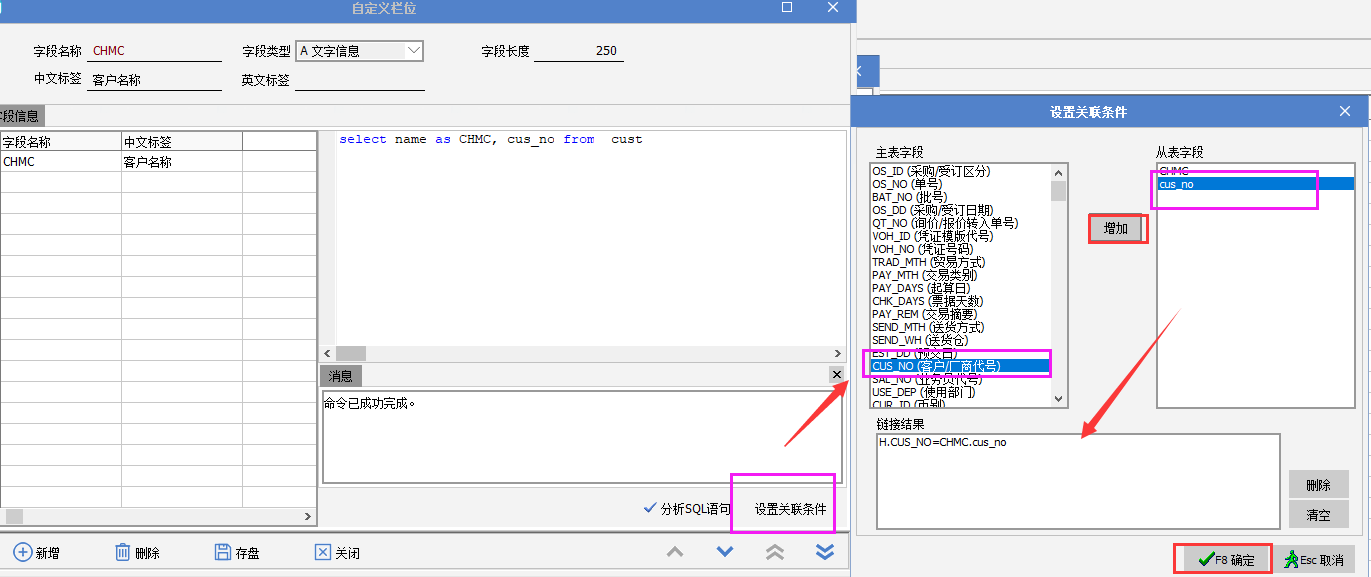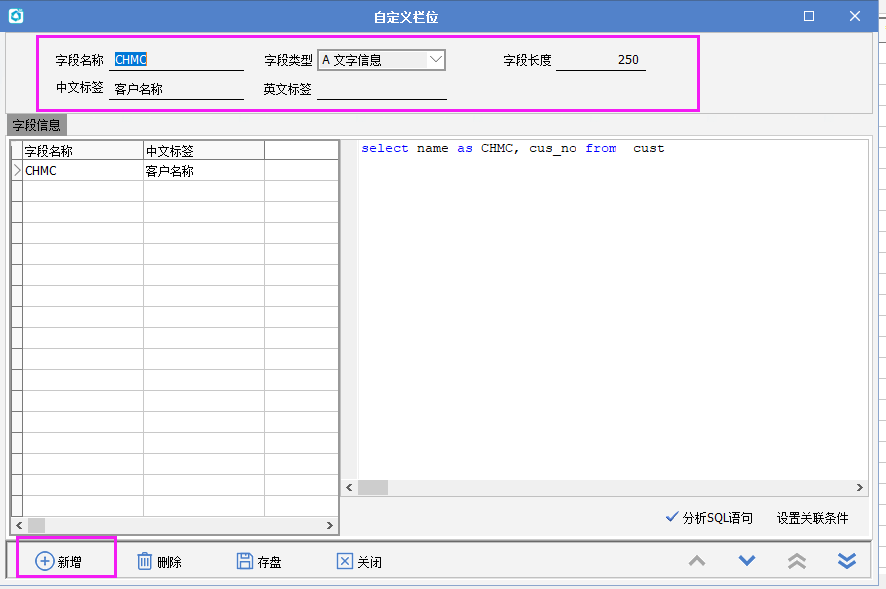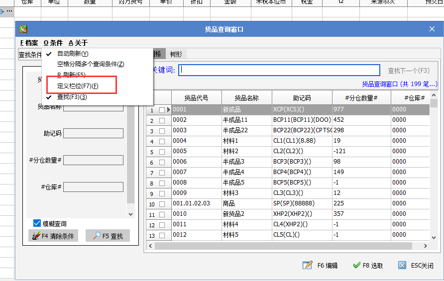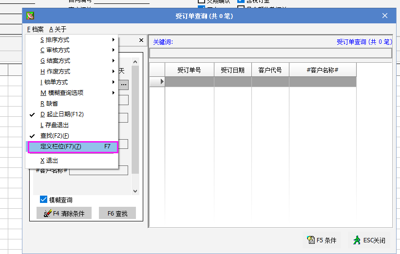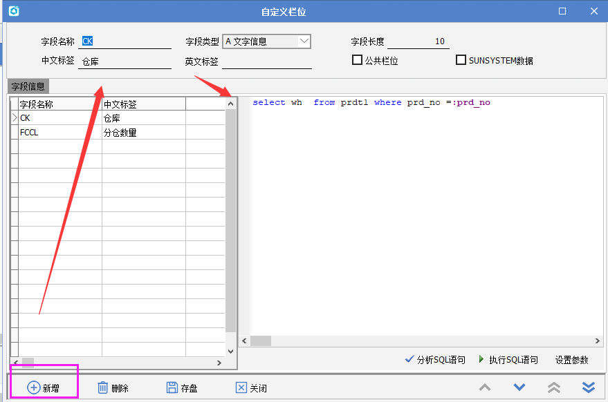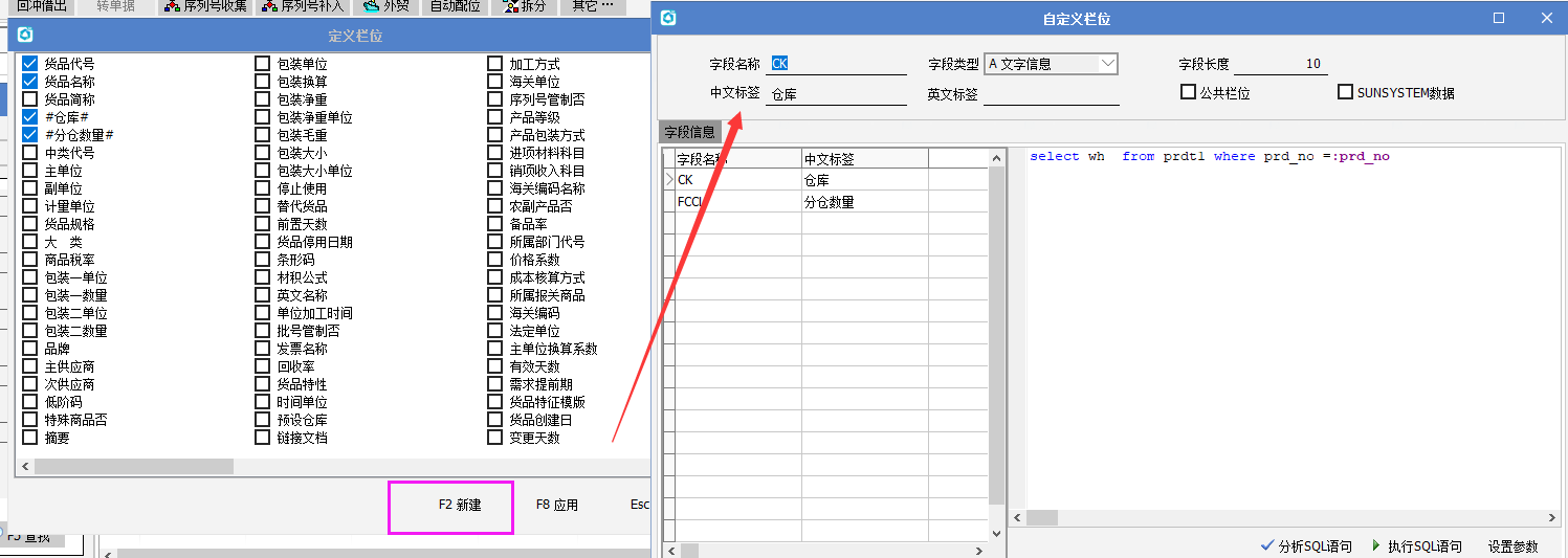 查詢窗口有兩種不同的設置方法,一種是直接查詢的窗口,例如貨品查詢,一種是速查的窗口,例如單據速查。 一、直接查詢窗口(貨品查詢) 1.貨品欄位點擊三個點進入查詢窗口 2. 條件—定義欄位 3.F2新建—自定義欄位 4. 新增,填寫字段名稱,中文標簽,字段類型,字段長度等欄位,例如:新建一個倉庫的自定義字段,字段名稱為:CK,中文標簽:倉庫,字段類型:A文字信息,字段長度:10, 語句格式 select欄位名稱?from表名 where 條件 select wh from prdt1 where prd_no =:prd_no 5.設置參數:分倉存量PRDT1表的PRD_NO字段與單據表身字段變量PRD_NO 相關聯 6.退出單據,再重新進入單據,進入定義欄位,才會顯示新建的自定義字段(倉庫),再勾選上倉庫(自定義字段,點擊F8應用。 二、速查—查詢窗口 1.檔案—自定義字段 2.F2新建 3.新增,填寫字段名稱,中文標簽,字段類型,字段長度等欄位,例如:新建一個客戶名稱的自定義字段,字段名稱為:CHMC,中文標簽:客戶名稱,字段類型:A文字信息,字段長度:250, 語句格式 select欄位名稱?as?自定義字段名稱,關聯字段from表名 select name as CHMC, cus_no from cust 4.設置關聯條件 主表字段:受訂單客戶代號CUS_NO等于從表字段-客戶廠商資料客戶代號CUS_NO,兩張表以客戶代號關聯。 5.退出單據,再重新進入單據,進入定義欄位,才會顯示新建的自定義字段(客戶名稱),再勾選上客戶名稱(客戶名稱)自定義字段,點擊F8應用。 6.規格的自定義字段比較特殊,規格要用convert轉換成varchar類型的, SQL語句寫法:SELECT?CONVERT(VARCHAR(100),SPC)?AS?GUIGE,PRD_NO?FROM?PRDT |