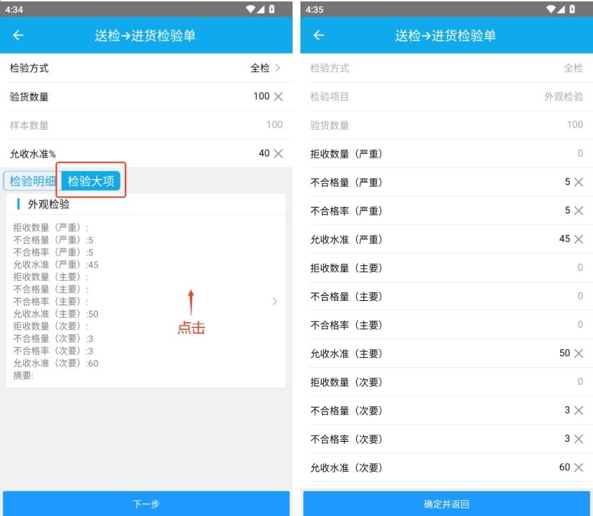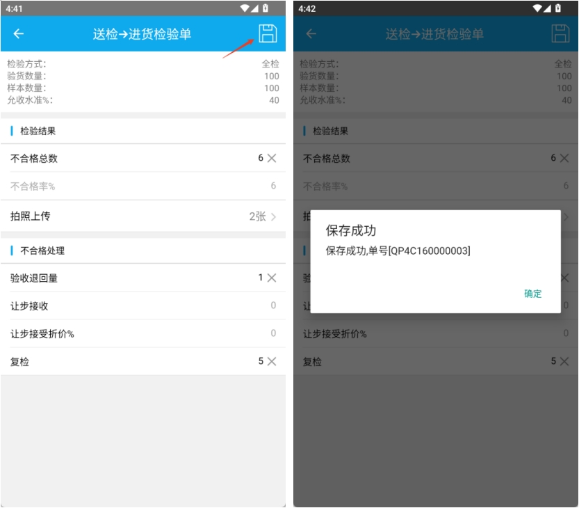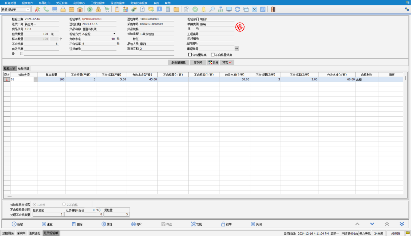 一、要點說明AI-WMS增加了【送檢->進貨檢驗單】,保存后生成的單據為ERP系統的【進貨檢驗單】。 1、要使用此單據,必須要在ERP系統先設置好【檢驗項目設定】和【貨品檢驗標準設定】。 2、檢驗后續處理: ◎ 檢驗合格及讓步接收的部分,通過ERP系統【檢驗單轉單處理-轉進貨】畫面,產生進貨單; ◎ 檢驗不合格、且不合格處理=驗收退回,通過ERP系統【檢驗單轉單處理-轉進貨驗收退回】畫面,產生進貨驗收退回單; ◎ 檢驗不合格、且不合格處理=復檢,通過PDA【送檢-進貨檢驗單】,進行重新檢驗。 適用版本:2024-12-20以后的365A版本。 二、功能說明1、ERP設置【檢驗項目設定】 2、ERP設置【貨品檢驗標準設定】 3、ERP錄入【采購單】 4、ERP錄入【進貨送檢單】 設置為需檢驗: 5、PDA錄入【送檢->進貨檢驗單】 打開單據,選擇“檢驗類型”,掃描進貨送檢單號,點擊【下一步】 ◎ 檢驗類型:支持“常規檢驗”和“復檢” 選擇要檢驗的貨品 確定“檢驗方式”(“全檢”或“抽樣”)、“驗貨數量”、“允收水準%” 點擊【檢驗明細】項次內容,如果有不合格的貨品,則選擇“不合格原因”,輸入“嚴重不良數量”、“主要不良數量”或“次要不良數量”,輸入完成后點擊【確定并返回】, 然后再繼續錄入下一個檢驗明細的資料 可以切換到【檢驗大項】頁簽,錄入檢驗大項的內容,然后點擊【確定并返回】 PS. 如果沒有顯示【檢驗大項】頁簽,可以在【AI-WMS單據屬性設定(Web)】中勾選開啟 點擊【下一步】 確定“不合格總數”,以及輸入不合格處理相關欄位 支持拍照上傳,可以直接拍照、也可以選擇相冊的圖片 選擇或拍照完成后,點擊【關閉】即可 然后保存單據即可 6、ERP查看【進貨檢驗單】 在PDA保存的單據,可以在ERP【進貨檢驗單】中查看 PDA上傳的圖片可以雙擊表頭的【聯接文檔】下載查看。 |