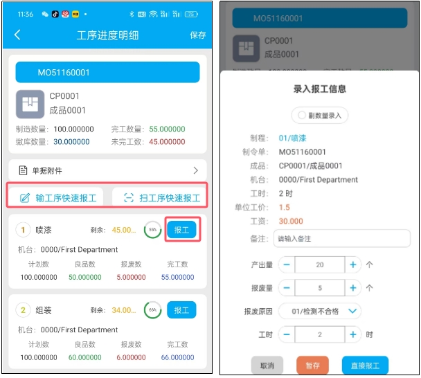 一、要點介紹工序進度單能夠實時記錄各道工序的完成情況,使管理者能夠迅速了解當前的生產進度。有助于及時發現生產中的瓶頸和問題,從而采取相應措施進行調整和優化。 二、新功能亮點1實時掌握生產進度:工序進度單能夠實時記錄各道工序的完成情況,使管理者能夠迅速了解當前的生產進度。 2.2優化生產流程:通過對工序進度單的分析,可以發現生產流程中的不合理之處,如工序銜接不暢、工時分配不均等。 三、功能說明3.1工序進度可按制令單或工序來展示 舉例:制令單:MO51160001,制造數量100個,有兩道工序; 工序1報工50,報廢數量5個; 工序2報工60個;報廢數量6個; 成品繳庫30個。 依制令單展示:列示制造數量、制成品完工數量,繳庫數量以及未完工數量 依工序展示:按工序列示計劃數量、制成品完工數量,未完工數量、良品數以及報廢數;并且每道工序會展示完工百分比。 3.2、通過工序進度單進行報工 在工序明細界面,可以通過掃工序或者點擊報工按鈕進行報工。錄入報工信息后會自動計算出工資。 |