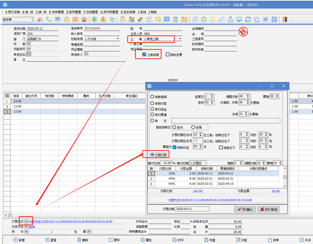 1.需求: 分期收付款的進貨單跟銷貨單表頭立賬方式都是是單張立賬,系統會自動產生多張進貨立賬收票作業跟銷貨立賬開票作業,但是客戶是先立賬后補發票的,并且可能存在多個發票號碼的情況,故進貨立賬收票作業、銷貨立賬開票作業增加屬性“分期付款單據發票補錄”。 2.屬性:“分期付款單據發票補錄”說明 1.不勾選:系統無法錄入發票號碼; 2.勾選:當進貨立賬收票是由分期付款方式產生的,大陸制發票視窗(INV_No_DLS):增加“補錄”按鈕。通過該按鈕,可以將視窗中的發票記錄保存至發票庫。 具體處理如下:點擊該按按鈕時,程序將根據發票視窗的結果進行以下回寫處理: 補錄檢測:管控視窗中所有記錄的“價稅合計”合計值必須小于等于單據的“金額”合計值。 補錄檢測通過后,執行以下處理: 當單據表頭庫[MF_LZ1].inv_no為空時:將發票視窗第一筆記錄的“發票號碼”回寫至該字段。 將發票視窗的記錄保存至發票數據庫[INV_NO]。 將發票視窗的“發票號碼”按單據別+單據號碼保存至進貨立賬開票作業發票數據庫[MF_LZ1_INVNO]。 3.操作說明(以進貨單為例,銷貨單同理可參考): (1)進貨單設置分期付款 (2)進貨立賬收票作業未勾選屬性“分期付款單據發票補錄”,分期付款產生的立賬收票作業無法錄入發票號碼 (3)進貨立賬收票作業勾選屬性“分期付款單據發票補錄” |